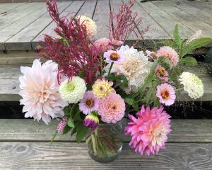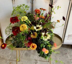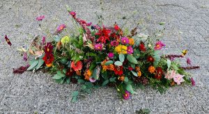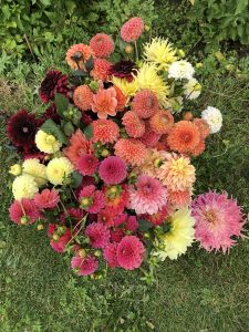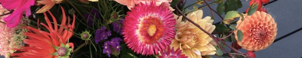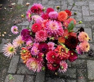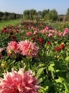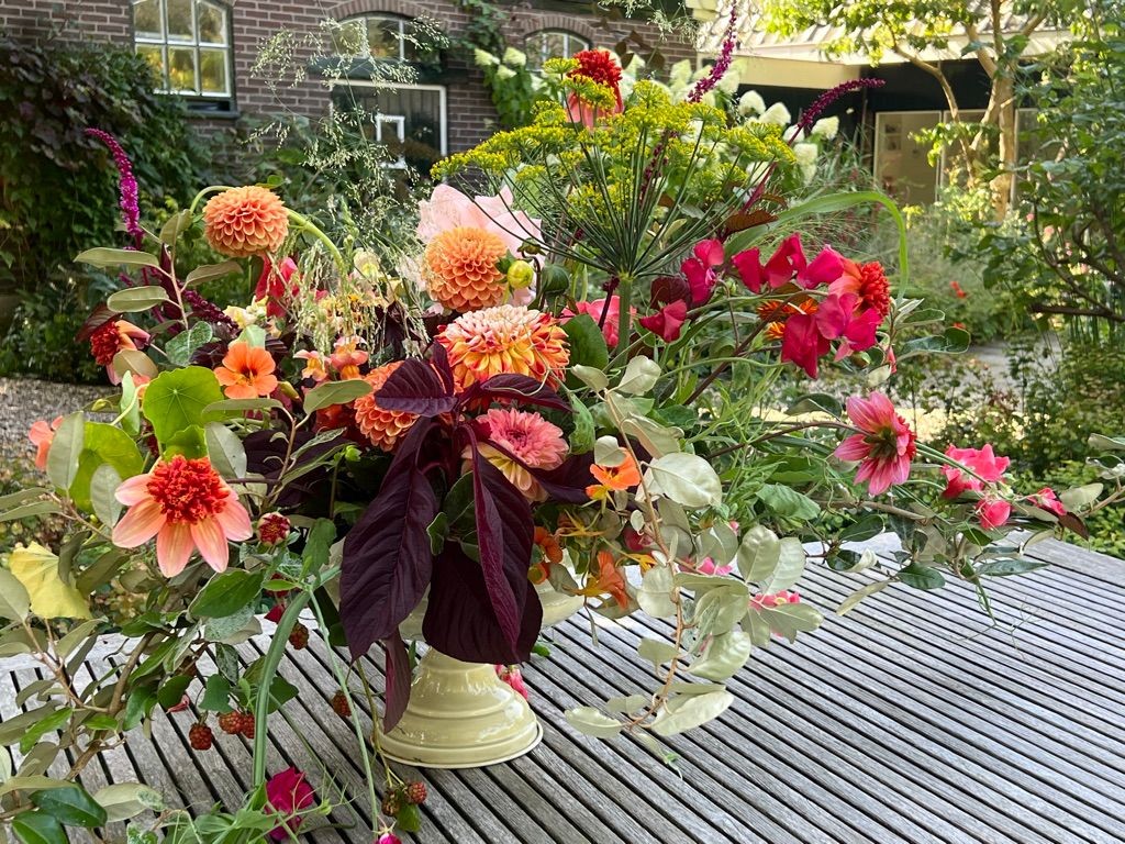 Zomer: o.a. goudsbloemen, bijzonder zonnebloemsoorten, cosmea’s, zinnia’s, amaranthus en natuurlijk dahlia’s in vele vormen en kleuren.