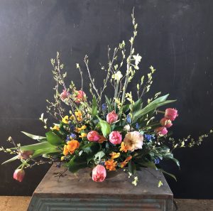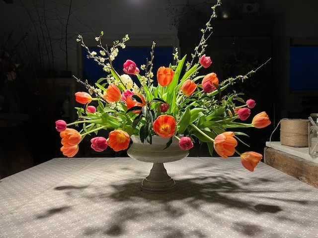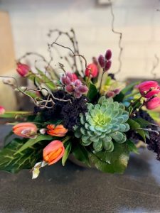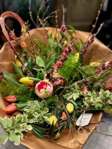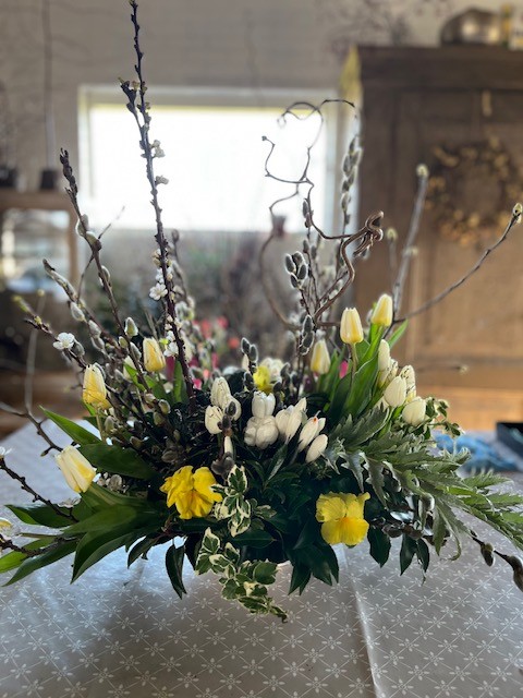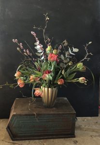 Lente: droogbloemen, grassen gecombineerd met tulpen, wilgenkatjes, narcissen en allerlei mooie grillig gevormde takjes, later in het seizoen komen daar bijvoorbeeld pioenen, duizendschoon en vingerhoedskruid bij.