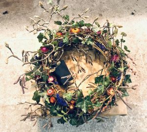 Winter: vele soorten (kerst)groen, dennenappels, bandwilg, kronkeltakken, grassen, eucalyptus, hier en daar een amaryllis, kerstballen, wat sneeuw, sterren en glitters, en na de kerst weer ‘back to basics’ met droogbloemen, tulpen, mooie takken en blad.
